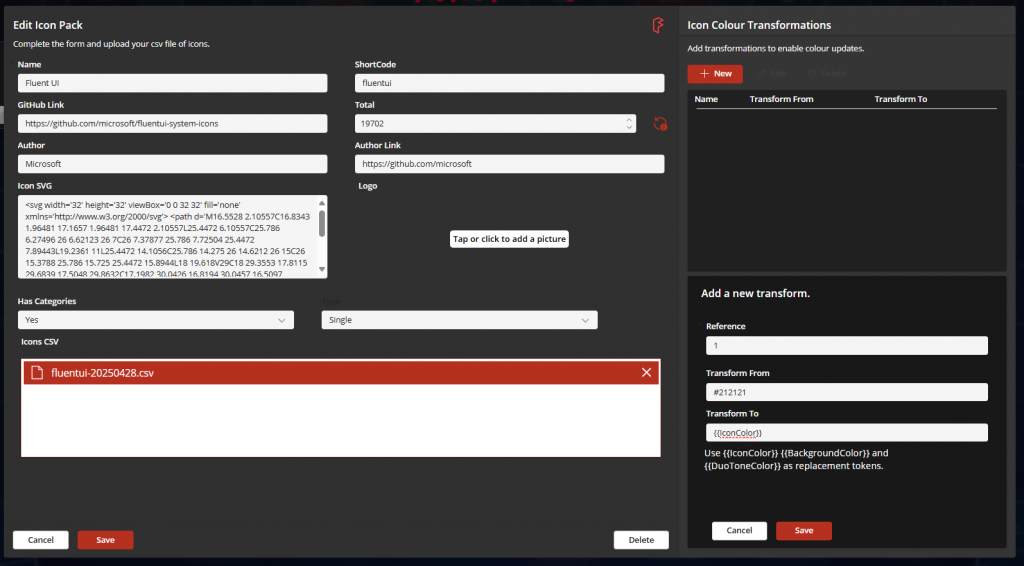 Go to the Icon Pack Management screen and click on the Fluent UI pack to edit and Click on New under the Icon Colour Transformations Panel.